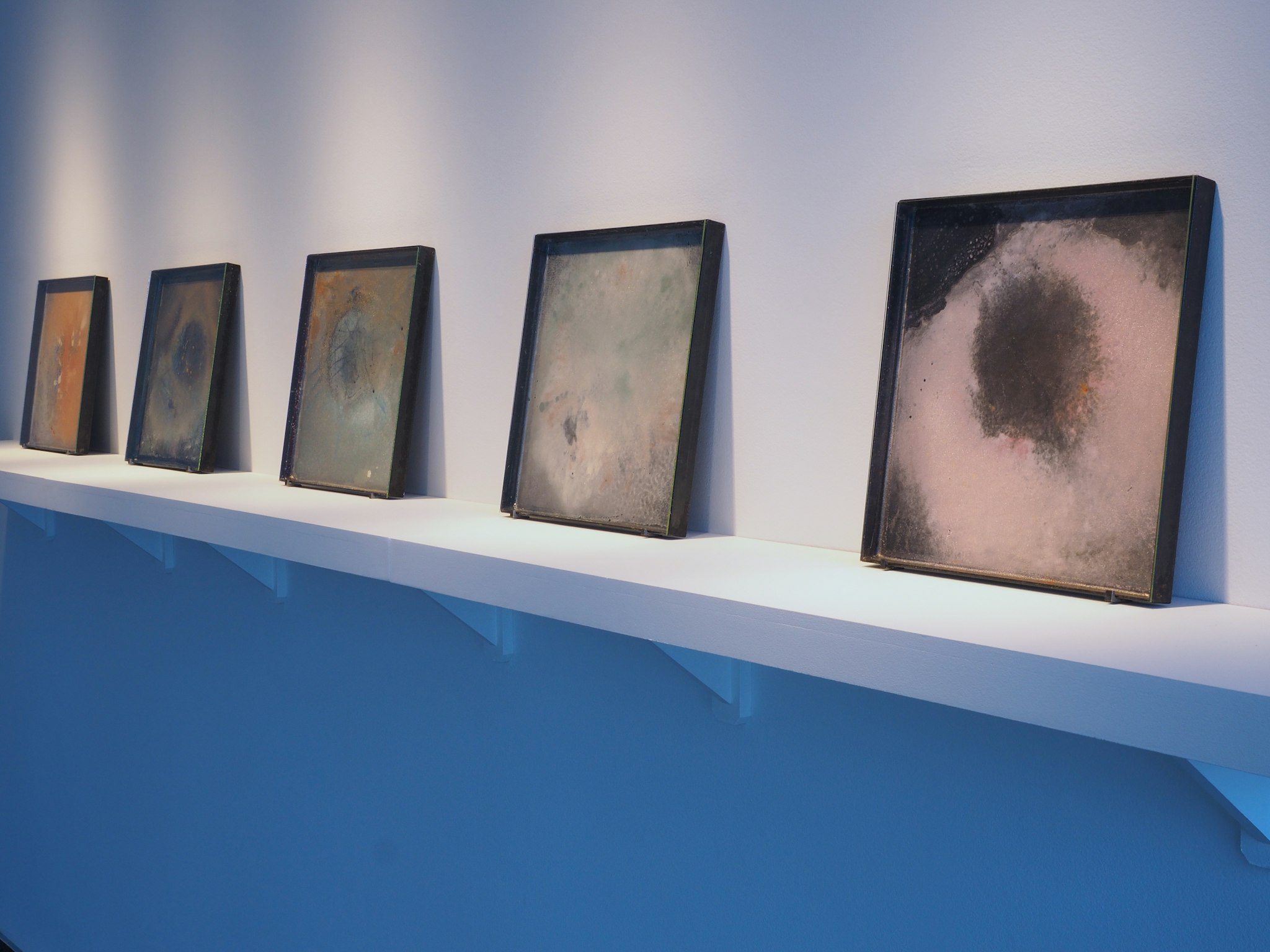 Dans l’univers créatif de Sandra Volny, tout prend forme à différents degrés de densité de vibrations et ces dernières sont porteuses d’une mémoire. Dans sa recherche de sons, l’artiste s’intéresse à certains types de territoires, particulièrement ceux qui sont soumis à des conditions extrêmes. Pour extraire les bruits invisibles de la nature, elle fait équipe avec des chercheurs qui enquêtent directement sur le terrain. Sa pratique est liée à la recherche scientifique, entre autres à la sismographie qui permet de mesurer les mouvements et les sons imperceptibles du sol. Dans cette exposition, Sandra Volny présente les sons inaudibles des sols de glace de l’Antarctique et des déserts de sable du Nouveau-Mexique. Connectant l’art à la recherche scientifique, l’artiste a développé un procédé qui lui permet de révéler et d’archiver la voix de la glace sur le métal. Les vibrations enregistrées par les sismographes sont rendues audibles grâce aux algorithmes du mathématicien et géophysicien Julien Chaput. Puis, elles sont projetées pendant près d’un mois sur des pigments en suspension dans l’eau. L’eau s’évapore lentement, les pigments se sédimentent au fond des grands bacs d’acier et des “fossiles” sonores apparaissent. Tout un univers sonore se révèle ainsi sous la forme de sons cristallisés.
