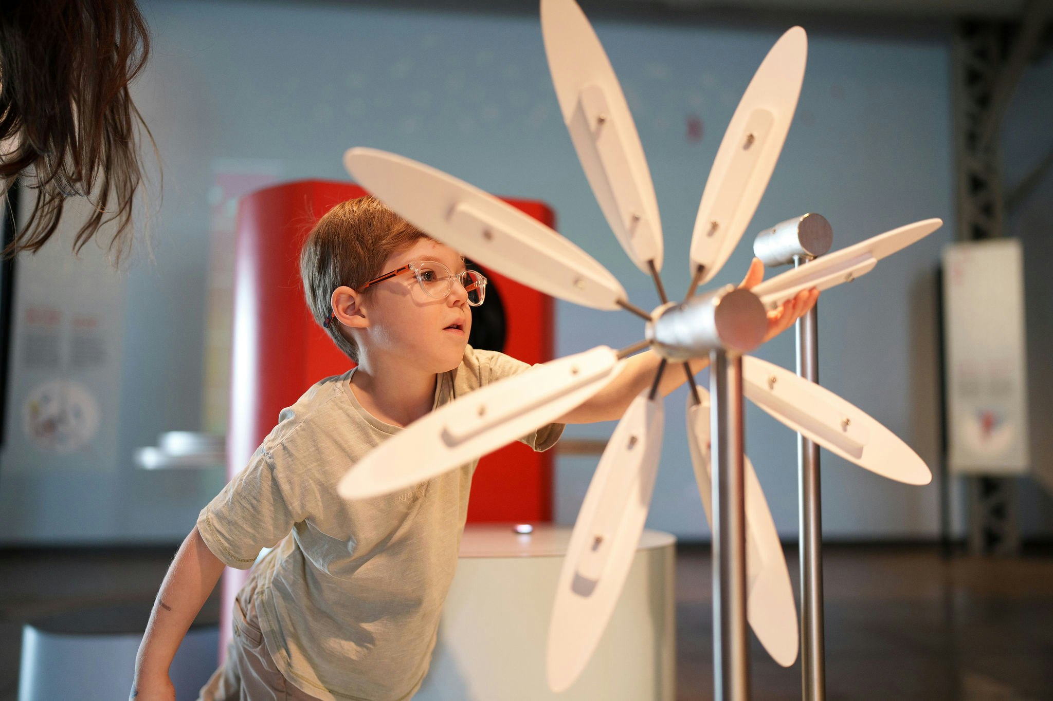Tout est dans la mécanique Découvrez l’univers ingénieux des machines simples comme les poulies, les engrenages et les leviers (en format géant!), laissez-vous déboussoler par l’effet gyroscopique à l’aide d’une roue libre et relevez le défi collaboratif d’illuminer un éclair géant en transformant vos mouvements en électricité. À la conquête du vent Explorez un élément invisible, mais d’une force tout à fait réelle. Venez jouer avec le vent, expérimenter la pression de l’air, ressentir l’effet d’une tornade et vous laisser fasciner par les trajectoires surprenantes d’un labyrinthe à air. Source de découvertes Vous serez heureux comme un poisson dans l’eau en batifolant autour de deux tables à eau qui vous révèleront les nombreuses forces et inventions que nous procure cette source de vie. Construisez des parcours d’eau, observez un véritable vortex et générez même de l’électricité!