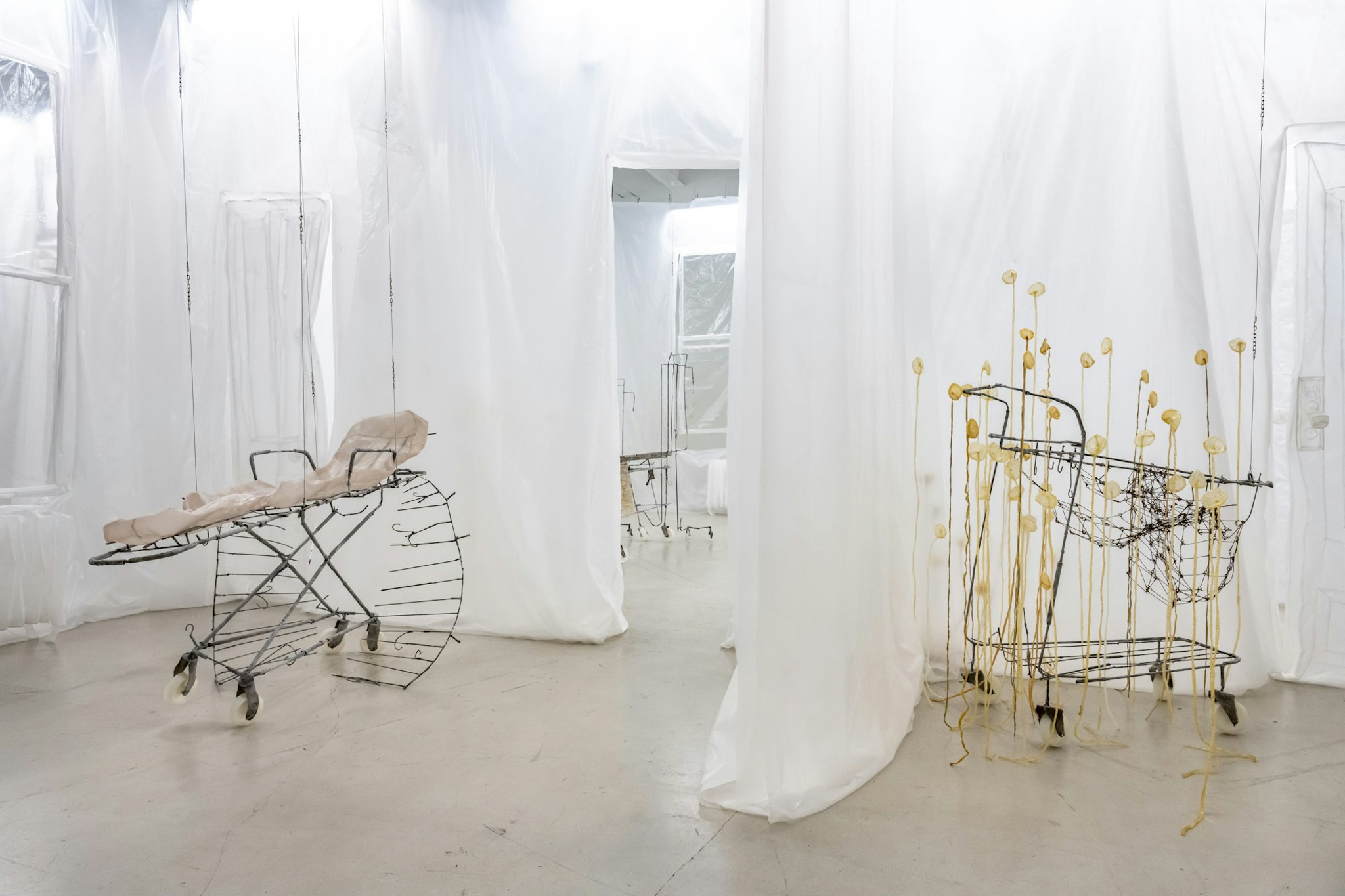 La notion de soin s’incarne autant dans les sujets explorés par l’artiste que dans le minutieux travail nécessaire à la confection de ses œuvres. L’assemblage de chaque élément demande une répétition du geste, alors que l’artiste soude, coupe, re-soude et recoupe l’acier composant la structure. La solidité du matériau semble ainsi fragilisée, sans toutefois l’être vraiment. L’acier est soumis à un processus d’oxydation avec l’ajout de vinaigre et de sel, puis une fine couche de cire d’abeille vient recouvrir le métal. Par la couture, l’artiste habille l’armature de plastique polyéthylène et de soie enduite de silicone. La combinaison de divers matériaux isolants transparents enveloppe l’installation d’un aura fantomatique. D’un même objet émanent autant la dureté que la fragilité, instituant ainsi une tension entre l’intérieur et l’extérieur, entre la structure et ce qui la recouvre. Ce faisant cette œuvre suggère formellement la fugacité de la matière et du temps.