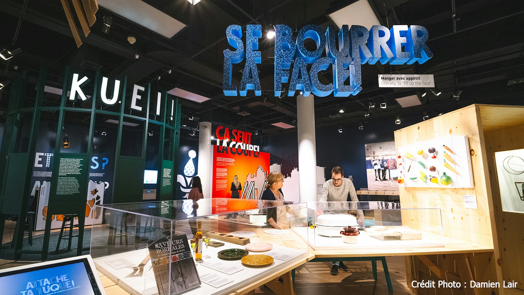 Une exposition sur la culture populaire québécoise qui regroupe les thématiques suivantes: langue, gastronomie, hockey, Premières Nations, contes et légendes, ingéniosité, hiver, musique. L’exposition est un portrait socio-culturel du peuple québécois présentée de façon ludique et interactive. Les enfants ont un parcours bien à eux.