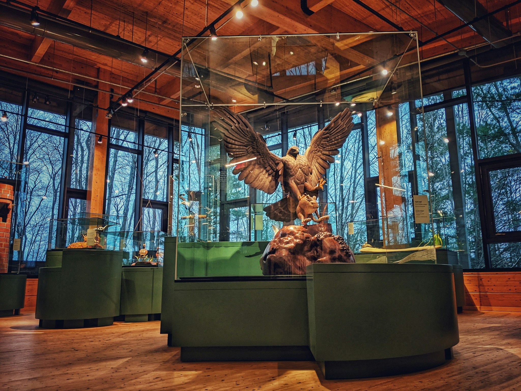 The Desmarais Collection features 21 remarkable wood sculptures of birds depicting 23 species found in Quebec. The species are represented by compositions that vividly depict scenes of life, some seemingly defying gravity. These life-size works, created by Quebec sculptor Louis St-Cyr and Canadian painter Brenda Fry, represent thousands of hours of work. The selection of species highlights certain bird populations considered to be increasing, declining, or at risk in the province. This underscores the importance of remaining vigilant regarding habitat loss and encouraging measures aimed at protecting, conserving, and enhancing biodiversity.